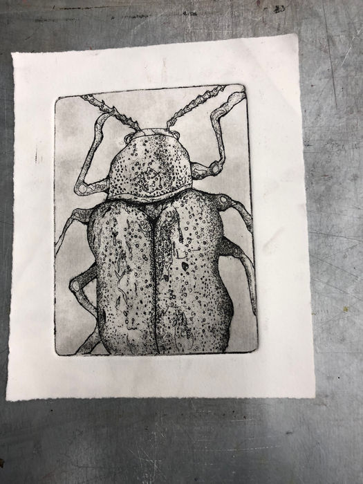 Green beetles are one of the bugs that I am scared of due to past experiences of them flying into me and getting stuck in my hair buzzing loudly. So OF COURSE I had to do a detailed intaglio print, illustration, & tattoo of this very bug.