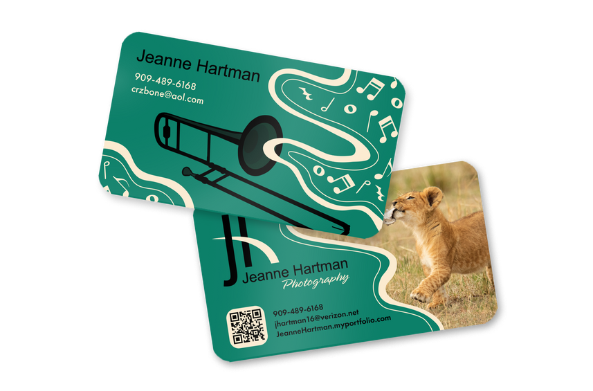 Business card created for a client that wanted one side for their trombone hobby and the other side for their photography business. They requested semi-gloss and rounded corners. The color palette, logo and lion photo were all provided.
