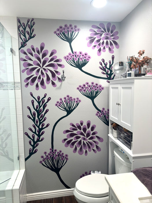I painted a custom floral mural in my paternal grandmother's bathroom. Her favorite color is purple, and I wanted to incorporate it in a playful yet mature palette. This was my first mural and took 3 sessions and 15 hours to complete.