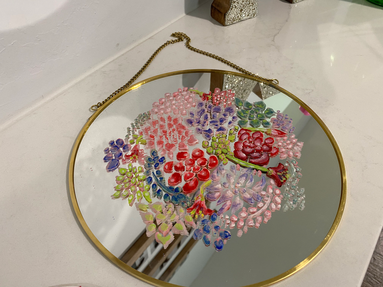 I painted succulents with acrylic paint onto a round mirror as a gift for my mother. She loves succulents, and I was inspired to do a colorful mirror painting to have her see her own reflection while viewing the painting to view herself as beautiful as the plants she loves.